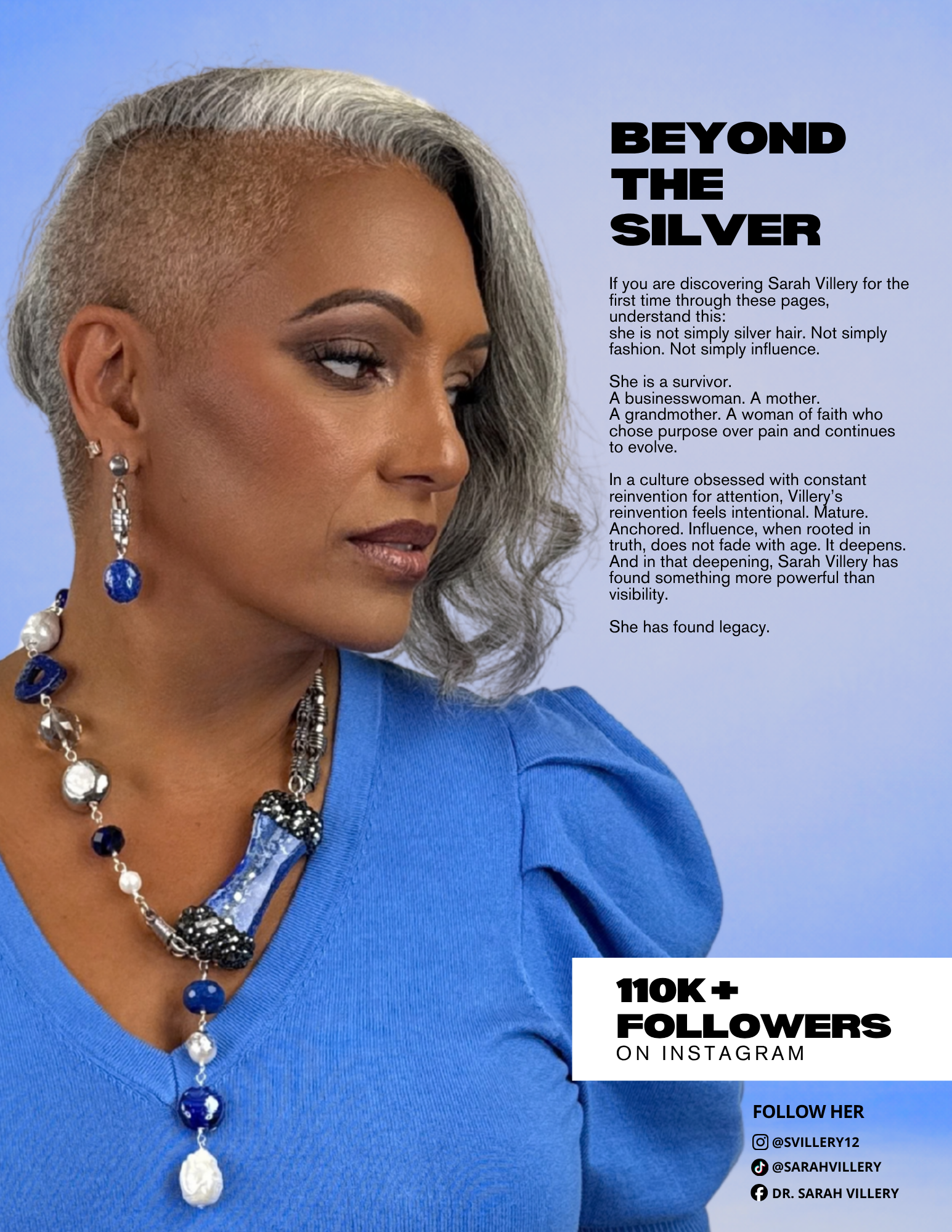 If you scroll her platform, the silver is unmistakable. But to Villery, silver hair was never simply aesthetic. It was liberation. In an industry that still prioritizes youth, women over forty and fifty are often encouraged to soften their ambition or quietly disappear. Villery refuses invisibility. She believes women are not waiting for space to be granted. They are creating it.